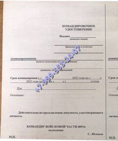 Заказать командировочное удостоверение военнослужащего в Карпинске можно и по иным причинам, например, необходимо срочно ехать на учения или в зону боевых действий. В таком случае следует обращаться к руководству с заявлением. Если человек потерял, или испортил документы, он может обратиться в нашу компанию. Купить командировочное удостоверение военнослужащего с доставкой мы предлагаем недорого.